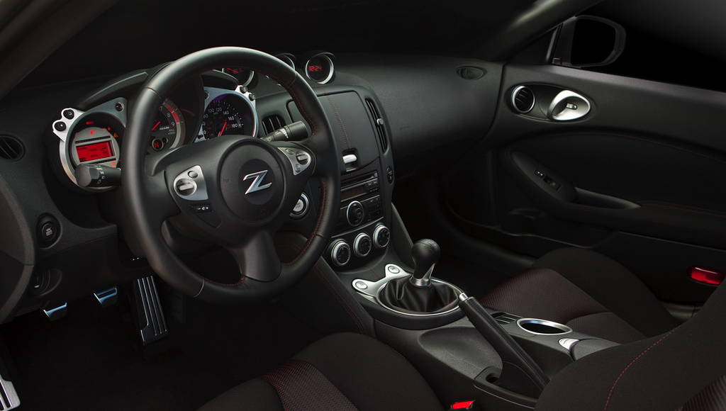 The interior includes NISMO logo seats with black and red fabric and red stitching, a NISMO tachometer, steering wheel with smooth leather and red parallel stitching, smooth leatherwrapped shift knob and aluminum trimmed pedals. A serialized plaque of authenticity is also matched to each NISMO Z®, identifying its unique serial and model year designation.
