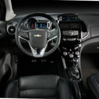 With its matte black interior highlighted by gloss black, metallic and blue accents, the Aveo RS show car reflects as much attention to detail as the exterior. The Boracay Blue theme continues inside, with accent stitching across the dual cockpit instrument panel, front and rear door insert, steering wheel rim, gear shift boot, parking brake, leather seat bolster and even the floor mats. The integrated center stack holds the gearshift, HVAC controls and the sound system, including a USB port. Ice-blue backlighting on the audio display, telltale indicator screen and knobs augments the blue stitching.