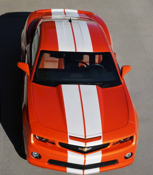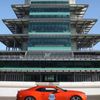 The 2010 Chevrolet Camaro Indy 500 Pace Car replica is based on the most generous trim level (2SS) with the RS appearance package and includes 20 inch polished aluminium wheels, two White Peral rally stripes, the ‘Inferno Orange’ front grille and engine cover and the 2010 Indianapolis 500 event logo on the doors and front fenders.