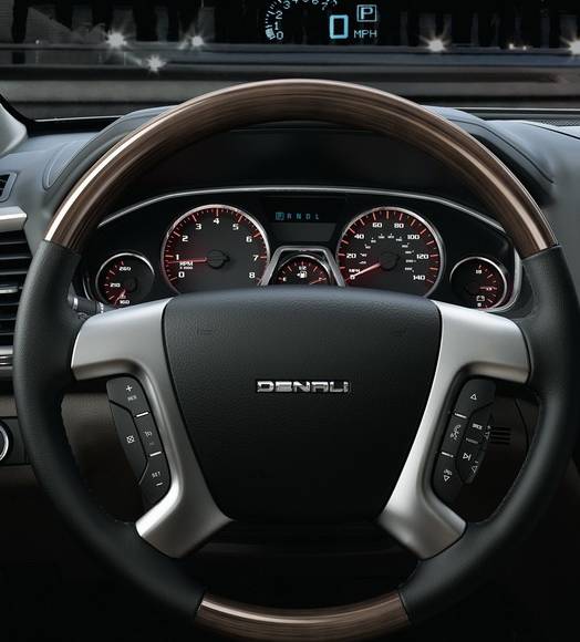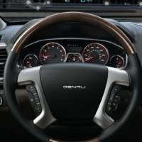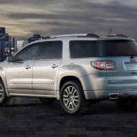 On the range topping 2013 GMC Acadia Denali the exterior and interior changes also include a polished grille along with wood trim and leather seats, while the engine powering both versions is the same 3.6-litre V6 from the outgoing mode, rated at 288 HP (215 kW) and 270 lb-ft (266 Nm) of torque.