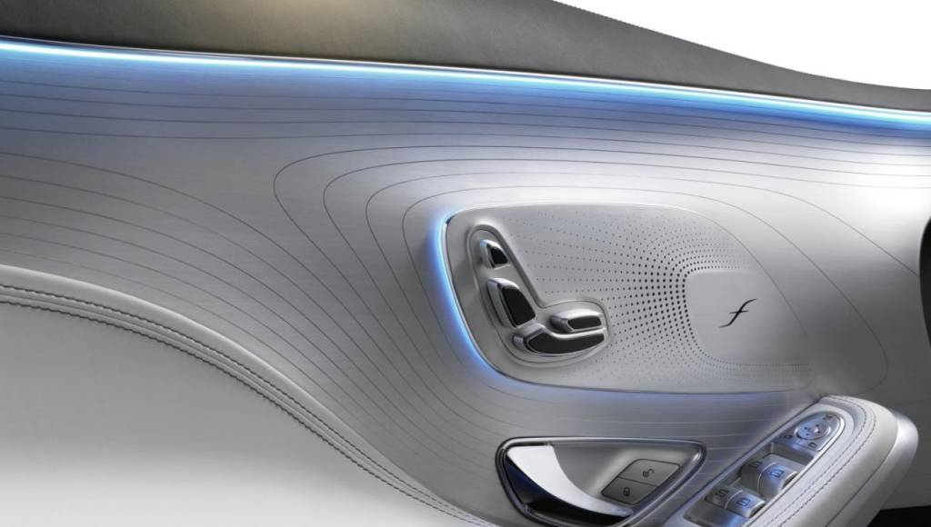 Inside the cabin we see a futuristic center console and a fancy instrument panel. The ventilation nozzles are manufactured from white aluminum with ceramic-like inserts and brushed/polished aluminum. There are also two 12.3 inch screens that are slimmer than the ones used on the S-Class saloon.