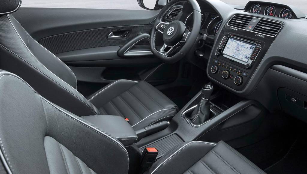 The interior of the Scirocco R. Similar to the exterior, the interior of the Scirocco R is marked by the hand of Volkswagen R GmbH. The individualised features include the "Race" seat covers with the "R" logo and decorative stitching in crystal grey, the black roofliner, decorative "Carbon Race" inlays, applications in glossy "Piano Black" (radio faceplate, multifunction leather sport steering wheel and door handles) and stainless steel pedals. The specific "R" instrument needles are traditionally blue and the aluminium door sill plates are complemented by an "R" logo.