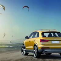 The Q3 jinlong yufeng features two kiteboards made of carbon fiber-reinforced polymer (CFRP) mounted on the roof, a flat outdoor pouch as a special cargo floor liner, and two rugged sports cameras known as Audi Cams, stored in the lft side wall of the cargo space.