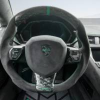 Masory boosted the naturally aspirated 6.5-liter V12 engine to 799 horsepower (810 PS) up from 759 HP and 780 Nm (575 lb-ft) up from 531 lb-ft of torque. The improvement resulting in 0 to 62 mph sprint of 2.6 seconds (0.2 second quicker) and top speed of 221 mph (up from 217 mph) over the stock Aventador SVJ.