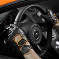 A variety of exclusive, high quality leather accessories complement the range, including a black leather wallet and card holder, finished in carbon fibre weave-effect leather with McLaren orange stitching, and a pair of elegant driving gloves produced from luxury full-grain black sheepskin leather, with contrasting McLaren Orange piping.