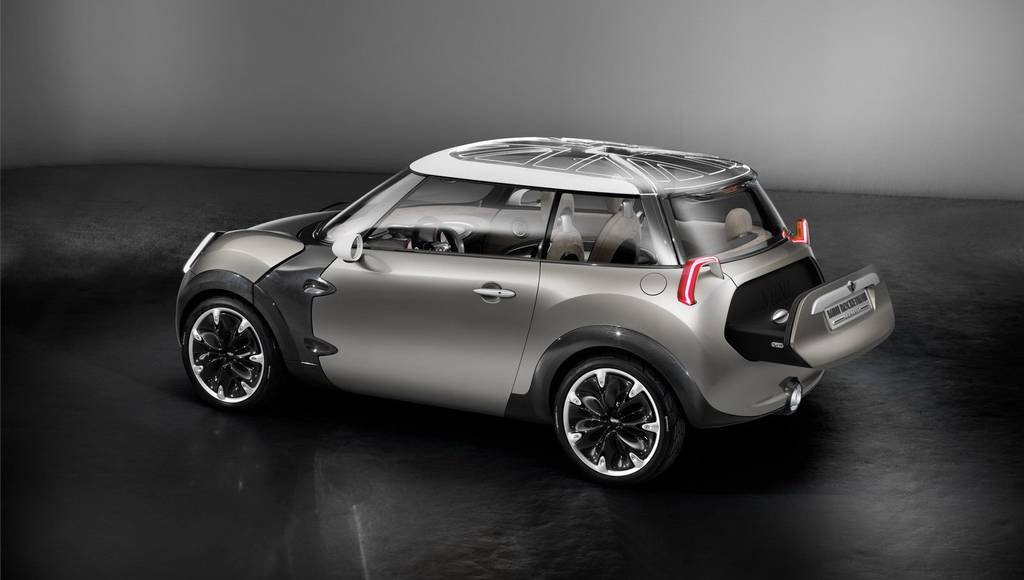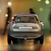 The MINI Rocketman Concept measures 3.41 m in lenght, 1,90 m in width and 1,39 m in height, uses a carbon spaceframe underbody, which is also visible at the exterior in areas like below the exterior mirrors, plus LED headlamps and taillights, a split-tailgate, 18-inch alloys and a transparent roof.