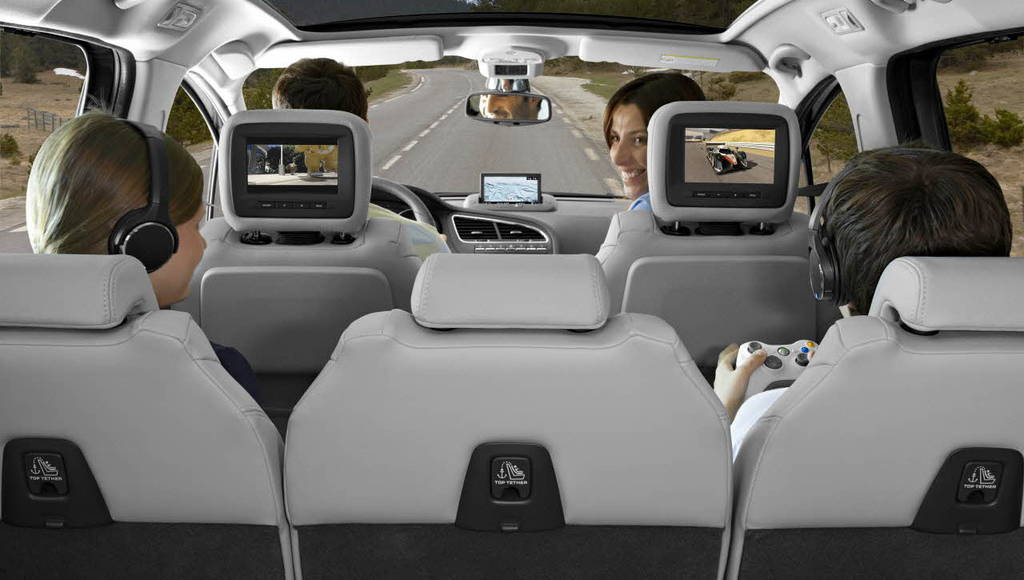 It consists of two 7’’ colour screens located in the front seat head restraints, a connection console to connect different types of mobile audio/video equipment (video console, games consoles, DVD player, etc) and two Bluetooth wireless headsets. This wireless technology is particularly efficient in terms of sound quality. It transmits the audio signal regardless of the position of the headset. A third headset can be purchased as an accessory and used simultaneously.