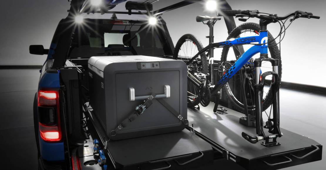 On the inside panel of the tailgate, a custom Mopar RamGate task-bench insert features various conversion charts, an angle finder and a concept T-track mounting system that adds to the sturdy and versatile workspace for cutting wood, tuning up bikes or sharpening skis. Inside of the class-exclusive RamBox cargo management system, Mopar cargo dividers keep additional tools or equipment safe and organized.