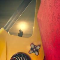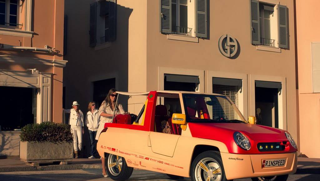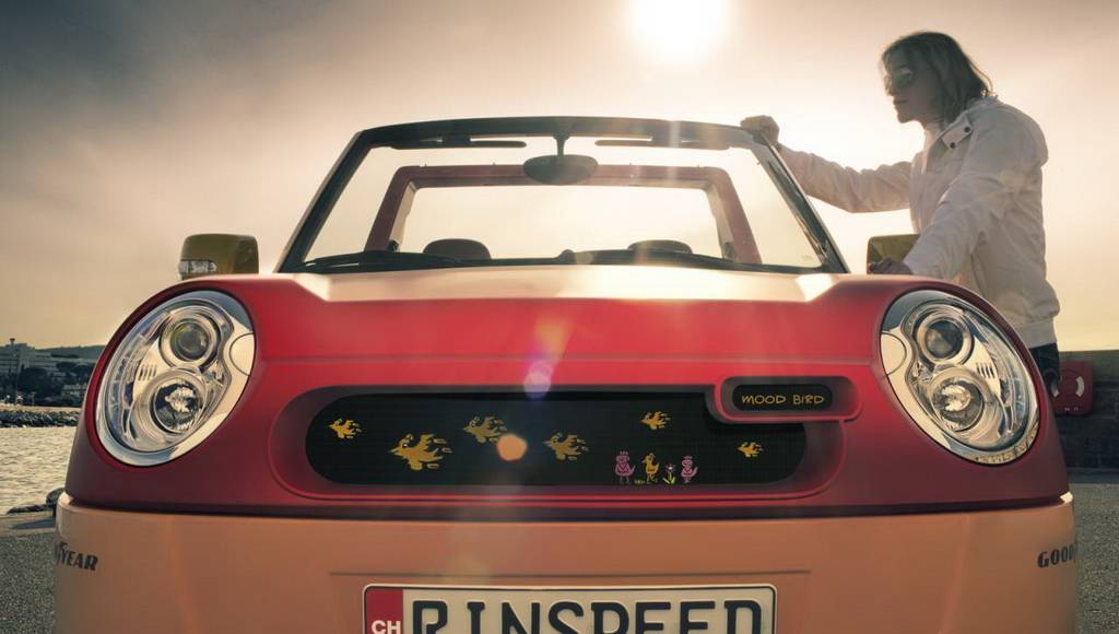 This car irritates. Could be that it’s the ingenious crafted creations of world-renowned New York pop artist James Rizzi. In any case, Frank M. Rinderknecht‘s latest work “BamBoo” lets the sun rise over the over-engineered metal creatures at the Geneva Motor Show, whose single purpose is to never touch anything other than black asphalt. Yes, this is a taste of summer. A taste of beach and sand, of the lightness and lightheartedness of southern latitudes. It is a reminiscence of the Seventies, of the south of France, of St. Tropez. Its colors range from salmon to lobster and yellow, shimmering in the sunlight, staged perfectly by color- and adhesive-repair-specialist (“StickerFix”) AkzoNobel. And one would expect to find Brigitte Bardot behind the wheel with playboy Gunther Sachs at her side heading towards Tahiti beach. But at the same time this car points to the future with clever innovations such as a communication display in place of a radiator grille and an inflatable roof that also serves as a beach blanket. Yes, this sun & fun car will blow the roof off!
