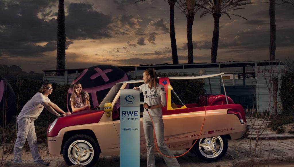With all this nicely packaged lifestyle the underlying technical specifications of the “BamBoo” are easily overlooked: The four four-seater features an electric motor from the German Fräger Group (German e-Cars) with 54 kW of power. This high-torque motor “made in Germany” accelerates the 1,090-kilogram vehicle to a top speed of 120 km/h. Lightweight construction does its part: The steel chassis with horizontal shock absorbers carries a sturdy composite body combined with the use of polymer plastic materials. Henkel supplies the structural foams as well as sealants and adhesives. The entire thing sits on 17″ AEZ three-spoke billet aluminum wheels with painted inserts and eco-friendly Goodyear “EfficientGrip” energy-saving tires in 17″. And the operating range? The battery’s capacity is enough for 105 kilometers – plenty for a fun car for short-distance traffic between hotel, beach and restaurant visits in the evenings. Speaking of range: Rinderknecht has also partnered with energy giant RWE, whose “intelligent” charging station demonstrates how an innovative infrastructure specialist tackles the issue of e-mobility. The advanced charger communicates with the car across all borders.