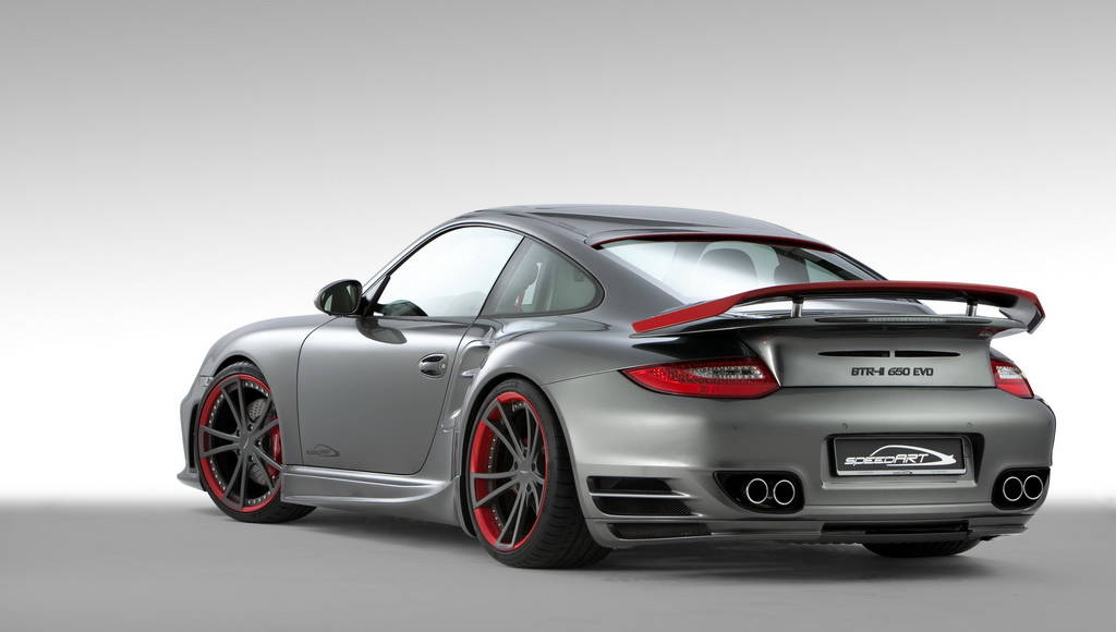 The speedART BTR-II 650 EVO (Bi-Turbo-Racer, 2. generation with 650 hp and Evolution-body kit). It is based on Porsche 997 Turbo with 3,8l engine and PDK shiftbox. The power increase of 150 hp and 150 nm consits of a modified motronic to enlarged the power boost in combination with bigger VTG-turbo chargers, a sport exhaust with sport cats and twin tail pipes plus sport headers/manifolds, sport air filter and enlarged intercoolers. The sport exhaust is available with sound control switch, too. The acceleration 0-100 km/h is 3,2 sec. and top speed over 330 km/h.